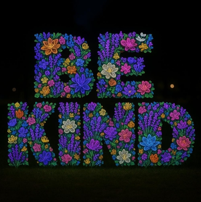 “BE KIND”, animata da fiori, foglie e dettagli naturali luminescenti.